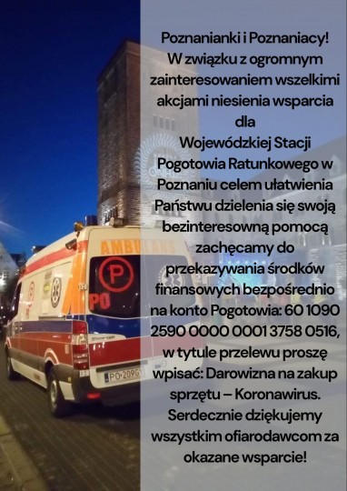 W związku z ogromnym zainteresowaniem wszelkimi akcjami niesienia wsparcia dla Wojewódzkiej Stacji Pogotowia Ratunkowego w Poznaniu celem ułatwienia Państwu dzielenia się swoją bezinteresowną pomocą zachęcamy do przekazywania środków finansowych bezpośrednio na konto Pogotowia: 60 1090 2590 0000 0001 3758 0516, w tytule przelewu proszę wpisać: Darowizna na zakup sprzętu – Koronawirus.